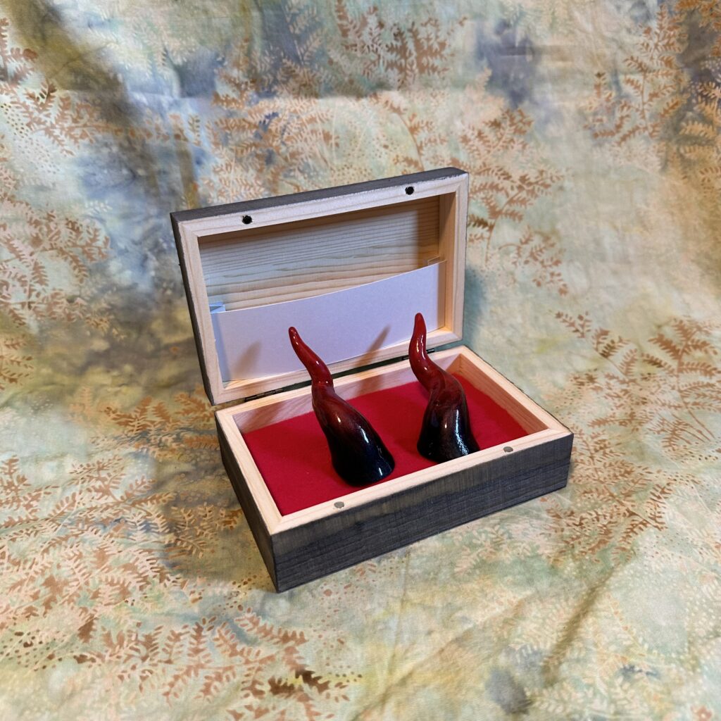 Because our horns are so lightweight, our customers reported their biggest issue was losing track of one or both in a pair, especially in pockets or purses (often found later hiding in a fold). So, each set comes in its own customized box that also includes a simple sleeve for extra double-sided tape.