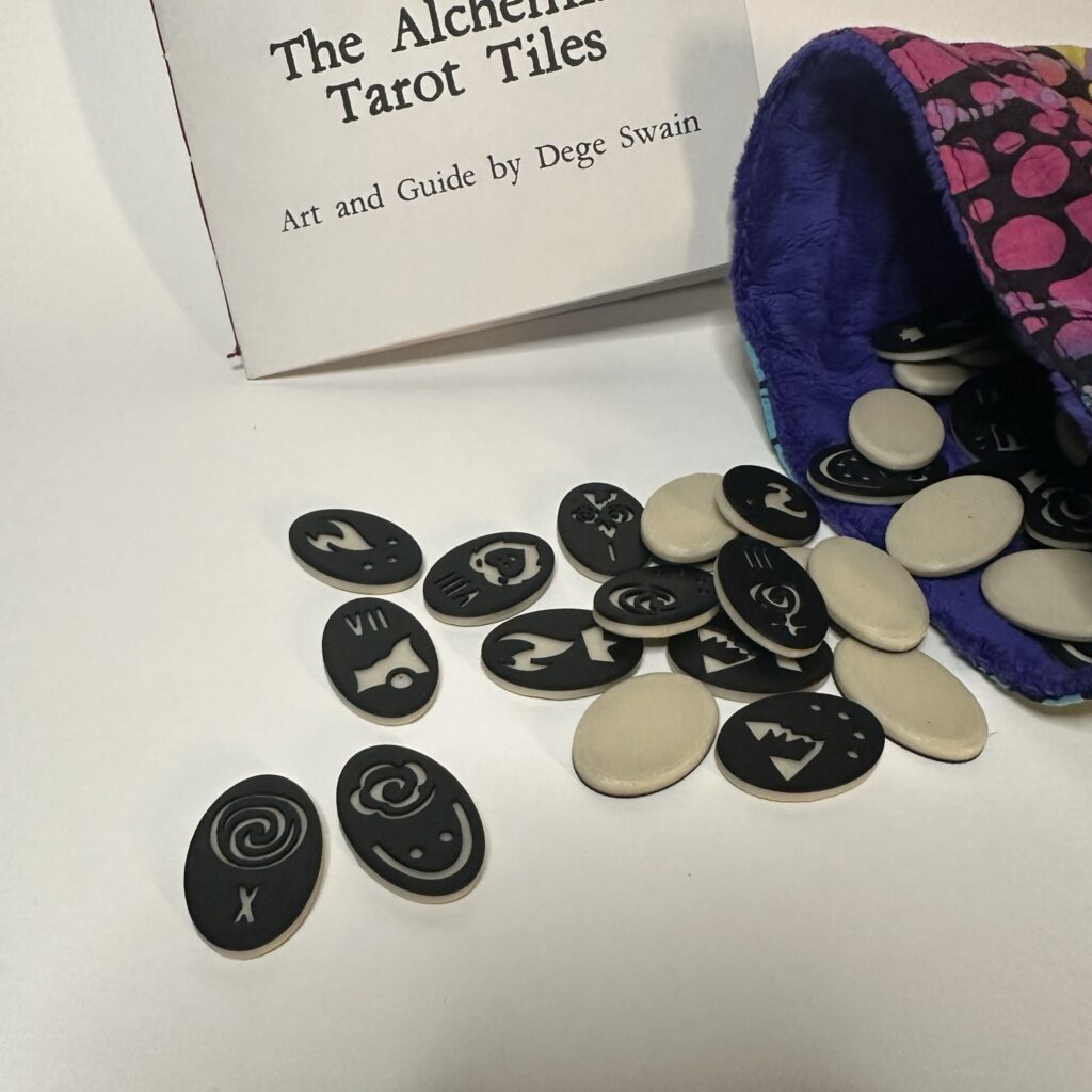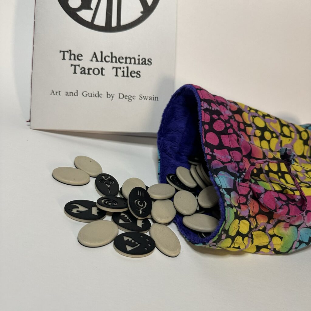 Our tarot tiles were developed as an accessibility item for people with dexterity limitations and colorblindness, but we’ve found that everyone enjoys using them! Each set is unique, having been hand-finished to varying degrees. All sets come with a hand-bound chapbook with guidance, layouts, and meanings of the tiles.